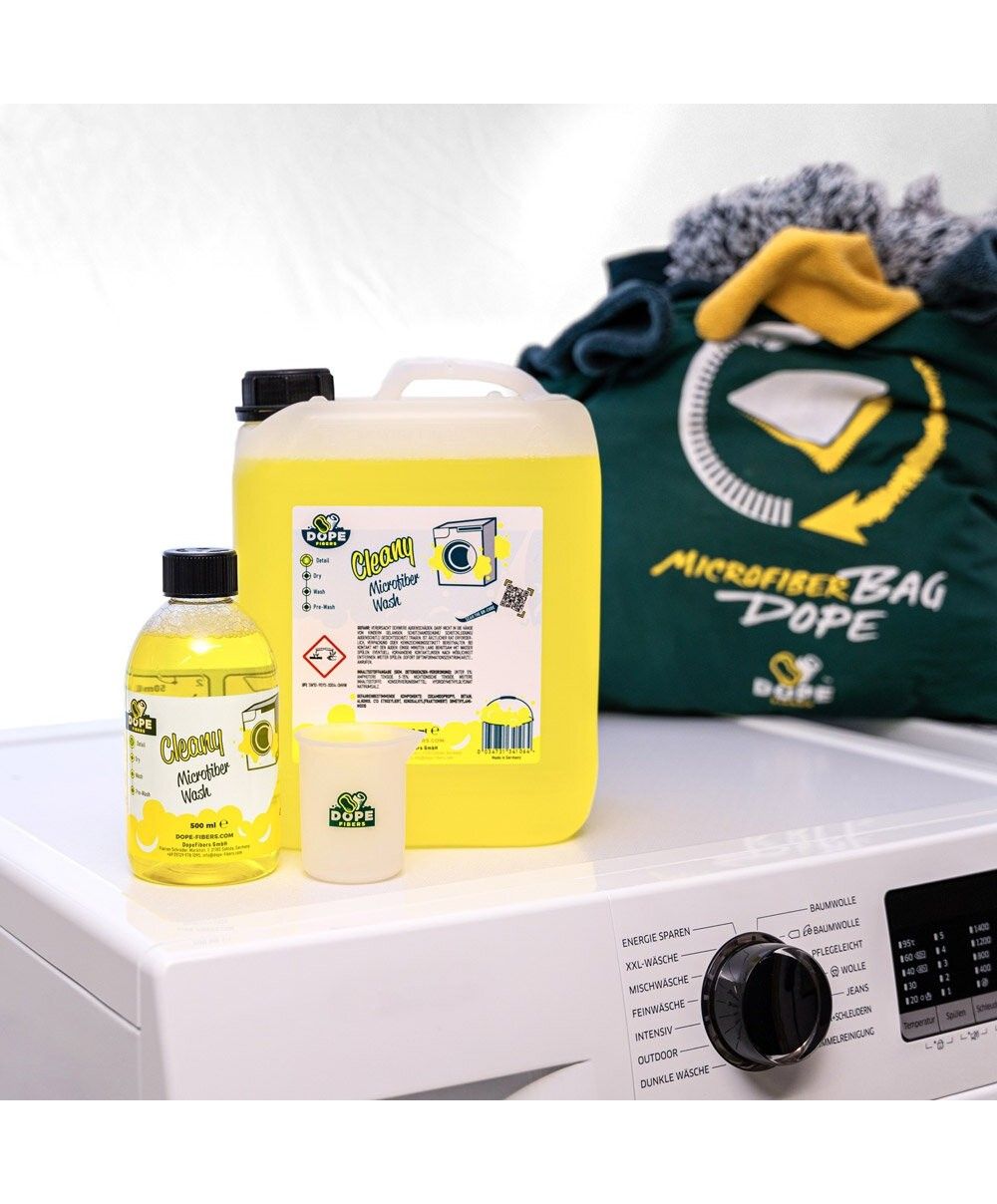 50 ml de detergent sunt suficiente pentru curatarea a 5 kg de lavete din microfibra. Se poate folosi pentru a curata lavetele din microfibra pana la 60 de grade si pentru a indeparta pur si simplu murdaria fara a fi spalate manual. Lavetele din microfibra pot fi, de asemenea, tratate in uscator ulterior. Daca lavetele din microfibra au intrat in contact cu un quick detalier sau un sealant lichid, va recomandam sa folositi 200 ml pentru 5 kg. Cu acest amestec mai concentrat, particulele de murdarie sunt mai bine dizolvate si vechea performanta de uscare a carpelor poate fi restabilita. Evitati intotdeauna contactul cu pielea cu detergentul si purtati manusi cand incarcati Dope Fibers Cleany Microfiber Wash in masina de spalat. In plus, ar trebui sa pastrati intotdeauna agentul de curatare bine protejat de inghet si caldura excesiva pentru a prelungi durata de valabilitate a acestuia.