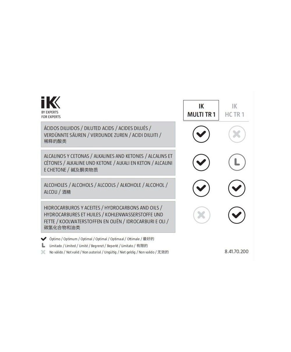 IK Multi TR 1 este un pulverizator usor si la indemana, care incorporeaza o baza pentru o stabilitate mai mare, un sistem de identificare a continutului codificat prin culoare si un rezervor translucid care permite verificarea nivelului de lichid din interior.